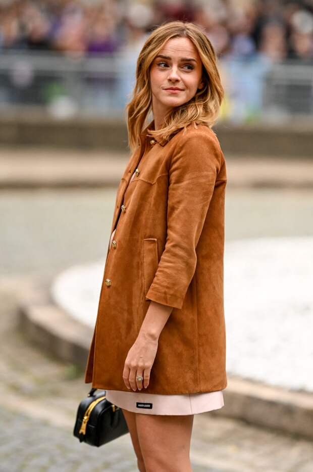 Образ Эмма выбрала элегантный. Актриса надела светло-розовое мини-платье прямого кроя в сочетании с замшевым тренчем. Их дополнили черные лодочки на небольших каблуках и маленькая сумочка с золотистой молнией и пряжками. Длинные золотисто-русые волосы Уотсон уложила легкими прядями, завершив образ нежным макияжем в нюдовых тонах.