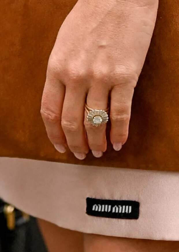 Она то и дело поправляла рукой волосы и активно жестикулировала. Кольцо было выполнено в винтажном стиле, который сейчас популярен у зарубежных звезд. Его украшал крупный бриллиант в центре, золотые «лепестки» и россыпь мелких камней.