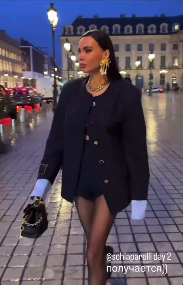Запомнился интернет-пользователям и другой образ Оксаны. Во второй день шоу Schiaparelli блогерша надела темно-синие мини-шорты. Их дополнили объемный пиджак с имитацией рубашки и черные прозрачные колготки со стрелкой. Завершили образ серьги в египетском стиле, массивная цепочка, лакированные каблуки и небольшая черная сумка.