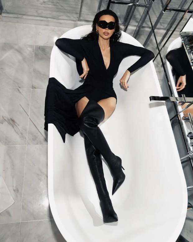 Оксана надела боди с черными ботфортами, а поверх набросила пиджак и кожаную куртку. Волосы блогерша оставила распущенными, гладко зачесав их назад. Завершили образ ультрамодные футуристические солнцезащитные очки.
